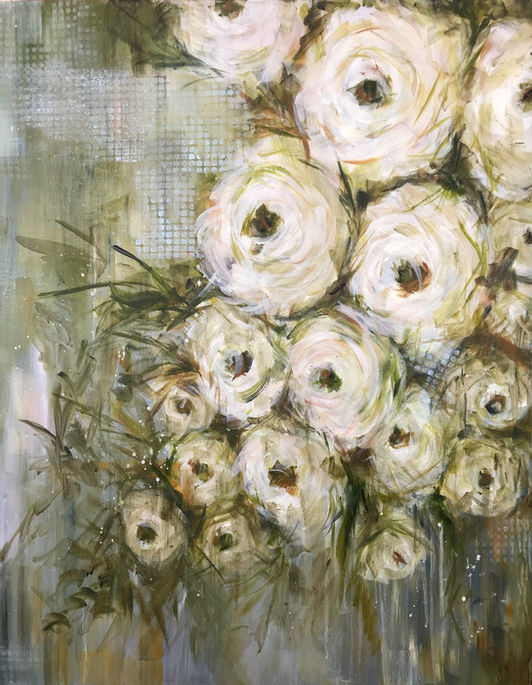 A romantic yet refined contemporary floral painting that captures the essence of modern cottagecore luxury, this oil on canvas artwork evokes the hand-touched beauty and layered depth often associated with encaustic art. Soft ivory garden blooms drift through mossy greens, weathered neutrals, and poetic texture—recalling heirloom botanicals, sun-washed cottages, and European countryside elegance, reimagined for today’s luxury interiors.